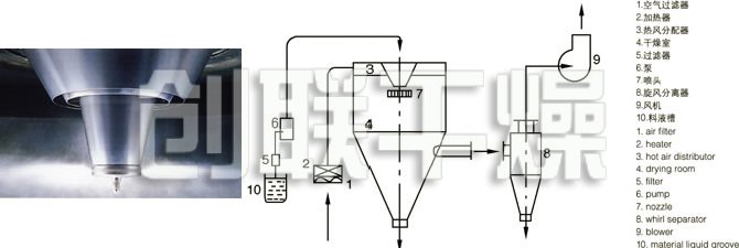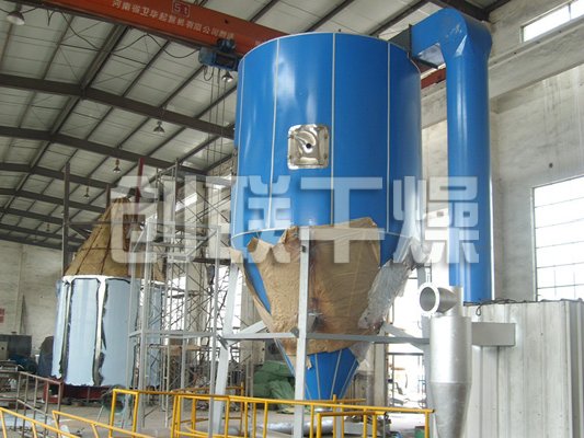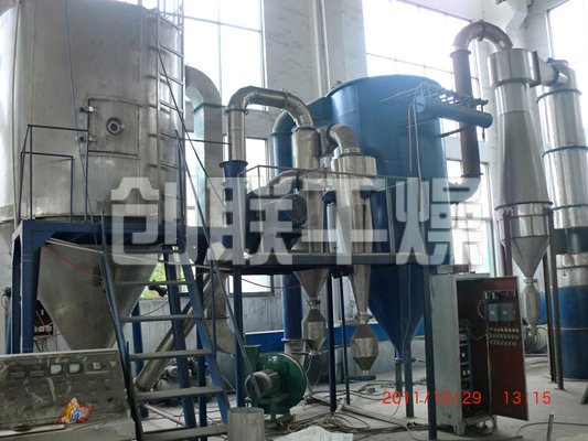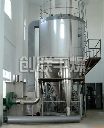空氣經(jīng)過(guò)濾和加熱,進(jìn)入干燥器頂部空氣分配器,熱空氣呈螺旋狀均勻地進(jìn)入干燥室。料液經(jīng)塔體頂部的高速離心霧化器,(旋轉)噴霧成極細微的霧狀液珠,與熱空氣并流接觸在極短的時(shí)間內可干燥為成品。成品連續地由干燥塔底部和旋風(fēng)分離器中輸出,廢氣由風(fēng)機排空。