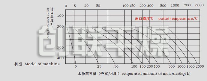注:水份蒸發(fā)量與物料的特性及熱進(jìn)風(fēng)、出口溫度相關(guān)。當出口溫度為90oC,其水份蒸發(fā)曲線(xiàn)見(jiàn)上圖(供選型參考),隨著(zhù)產(chǎn)品不斷更新,有關(guān)參數變更,恕不預先通知。