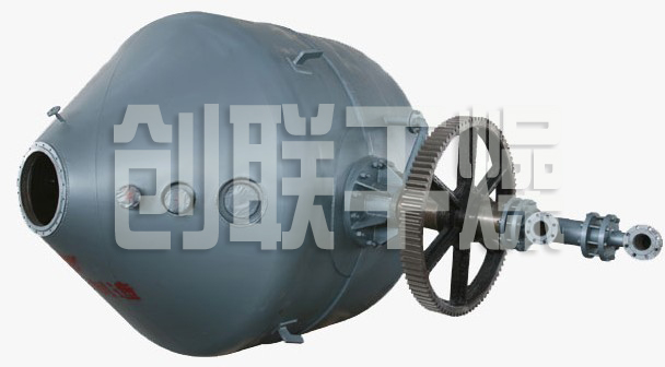 本機設計為雙錐形罐體,一頭為過(guò)濾板,另一頭為淋洗及出料口,夾套內可通入蒸汽或熱水對內膽進(jìn)行加熱。罐體通過(guò)主軸置于兩側機架上。主軸兩端一頭為蒸汽及冷凝水接口,通入蒸汽完成加熱過(guò)程,另一頭為抽真空口,通過(guò)真空泵或真空系統,使罐內呈真空狀態(tài),完成抽濾過(guò)程,并在干燥過(guò)程中抽走蒸發(fā)出來(lái)的水汽。電機和減速機也置于機架內,通過(guò)齒輪傳動(dòng),帶動(dòng)罐體正反轉,使物料不斷上下、內外翻動(dòng)。在洗滌過(guò)程中可使物料充分均勻混合,徹底完成洗滌過(guò)程。在干燥過(guò)程中,可不斷地更換受熱面,使物料受熱均勻,達到均衡干燥的目的。