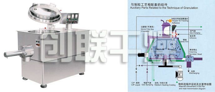 粉體物料與粘合劑在圓筒形容器中由底部混合漿充分混合成濕潤軟材,然后由側置的高速粉碎槳切割成均勻的濕顆粒。